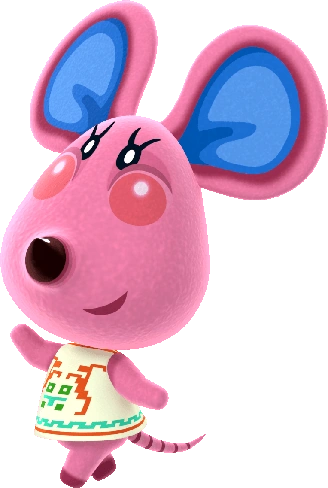 Es una ratón rosa, con el interior de las orejas azules y los cachetes brillantes.