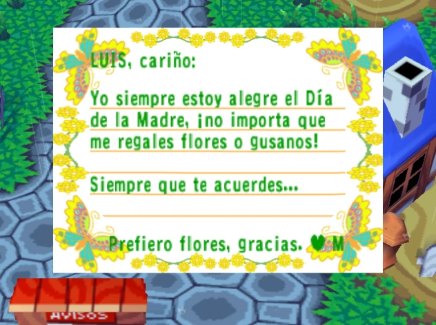 Al igual que en Animal Crossing: City Folk/Let's Go To The City , tu madre te envía una carta con un clavel rosa.