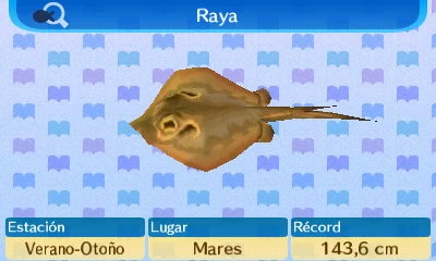 Para identificar a la Raya, debes imaginarte una lubina un poquito más grande pero sin llegar a ser algo como un Pez Espada. En Animal Crossing: New Leaf una buena alternativa para pescarla será ir a la isla, puesto que se encuentra con más facilidad.
