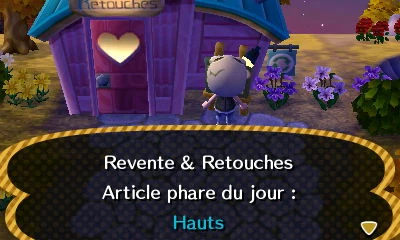 L'article phare du jour est inscrit sur le panneau qui se trouve devant Revente & Retouches ou la Boutique Nook selon l'opus, comme son nom l'indique il est chaque jour différent.