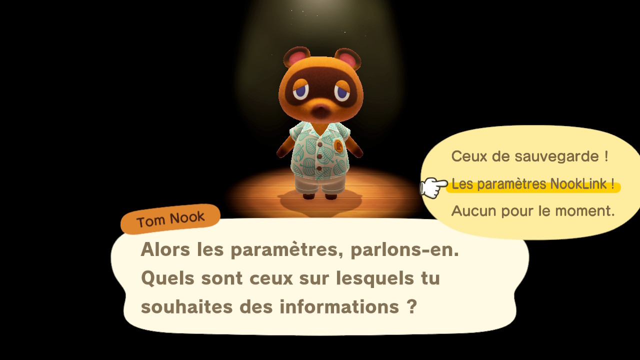 Il doit ensuite démarrer New Horizons sur sa Switch et appuyer sur le bouton - (Paramètres) sur l'écran d'accueil. Face à Tom Nook, il doit sélectionner "Les paramètres NookLink !" puis "Oui, oui !".