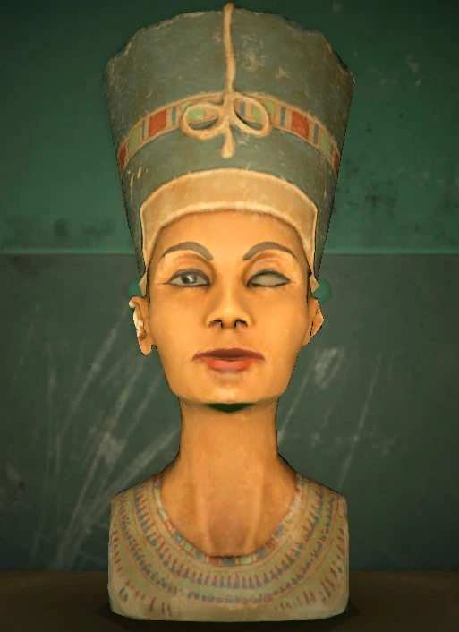 Dans New Leaf, la coiffe de Nefertiti est ronde sur la contrefaçon.