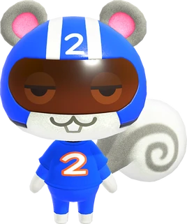 Agent S wears a blue helmet with two vertical white stripes that has the #2 between them in white. The helmet covers most of her head, and a translucent dark brown visor covers her eyes, which are half-closed and circle shaped with round black pupils. Her arms and legs are blue, and her hands and feet are white. This makes it appear as if she is wearing a full on suit, which matches the color of her initial clothes. She has a smile that is like a sideways 3, with a buck tooth sticking out of it. Her tail begins as gray but fades into white, with a swirl that is also the same gray as the rest of her body. The insides of her ears are pink. Prior to New Horizons, her arms and legs had stripes which consisted of a thick white stripe surrounded by two thin black stripes, giving more detail to her "superhero suit"-like coloring, but it appears that these stripes have since been removed, and she instead wears a pair of white boots. Her initial clothing is the No. 2 shirt.