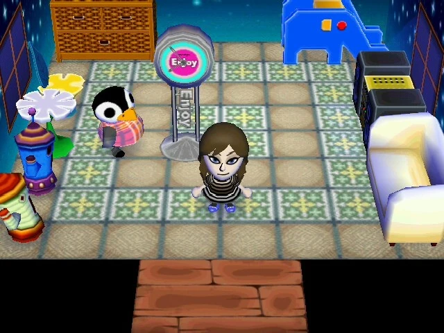 Aurora, a penguin villager in Animal Crossing, exhibits a normal personality type and has an education hobby. She has been a part of every Animal Crossing game. Her house, although without a specific theme, is adorned with numerous clocks, an iris table, daffodil chairs, an elephant slide, and a red boombox playing K.K. Swing. The lunar horizon wallpaper and kitchen tile flooring complete her abode.