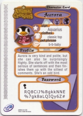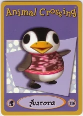 Aurora (オーロラ,Ōrora?) is a normalpenguinvillager in the Animal Crossing series. She is named after auroras, which can be seen in the skies above the South Pole, where most species of penguins live. Her initial phrase comes from pronouncing "baby" while shivering, which happens when words are pronounced usually in cold weather or climates; it is quite similar to Roald's, Cube's, and Gwen's. She has appeared in every Animal Crossing game to date. She has the education hobby.