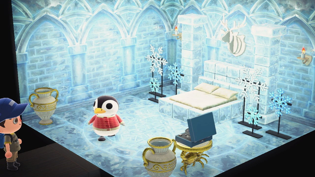 In New Horizons, Aurora's house has cream-colored wooden siding with a white basic door and a black tile roof. The interior has the ice wall and ice flooring. She has two Aquarius urns, a Cancer table, two frozen pillars, a frozen bed, a frozen partition, and two white illuminated snowflakes. She also has a blue portable record player which plays Stale Cupcakes.