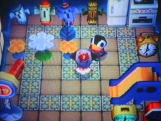 In Wild World and City Folk, Aurora's house is mostly unchanged. Her elephant slide is still there, and she has an iris table and a daffodil chair. She also has removed most of her clocks, except for the kitschy clock. She also has a gold stereo that plays K.K. Gumbo. Her floor and wallpaper are the same as in the last game.