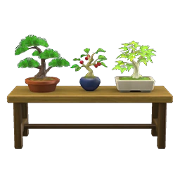 Bonsai shelf is a craftable houseware item in New Horizons. It has no variations and cannot be customized. The DIY recipe can be obtained from a cranky island resident or a message in a bottle. The shelf requires 1 cherry-blossom bonsai, 1 pine bonsai tree and 8 pieces of wood to craft.
