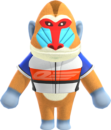 Boone is a brown gorilla with blue cheeks and a red face, giving him the appearance and likeness of a Mandrill, which is actually a species of monkey native to Africa. His name and initial catchphrase are references to Baboons, although baboons are a species of monkey. Boone's hands are gray and he has a white stomach. His initial clothing is the Indian shirt. In New Horizons, his initial shirt is changed to a cycling shirt.