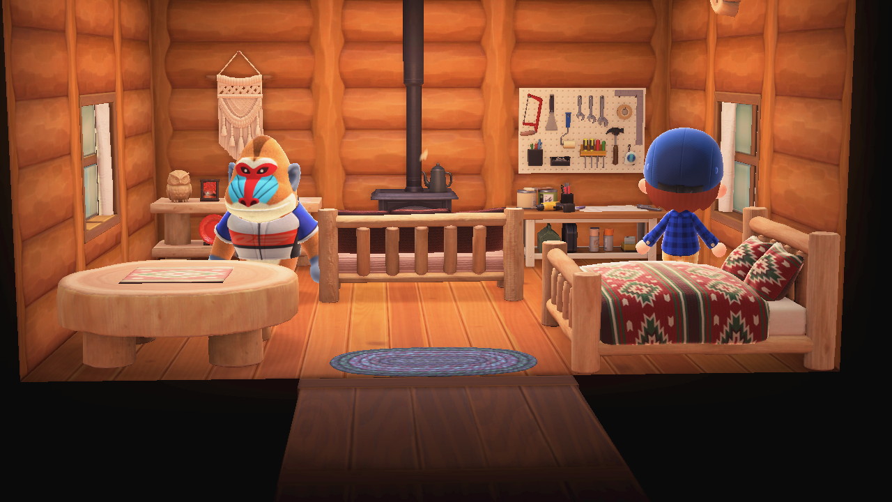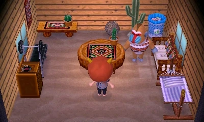 Boone's house consists of furniture from the western theme and other random pieces of furniture, such as two cacti and a trash can. He listens to K.K. Western.