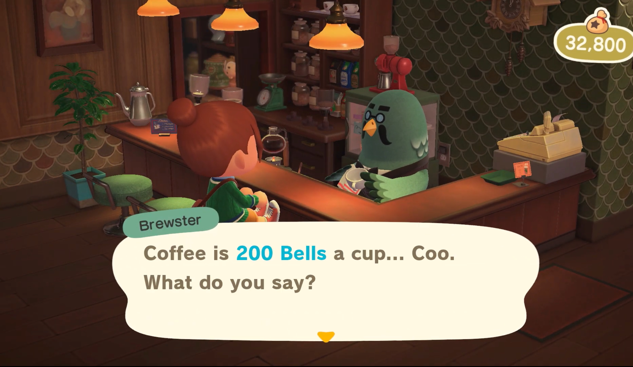 After the player has visited the The Roost enough times, they may be able to request what kind of coffee they would like, rather than having a takeout coffee. Brewster may ask what kind of coffee, how much sugar, or how much milk the player would like. Later, the player may choose to either have their usual, or change what they would like.