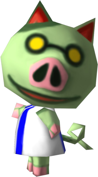 Cobb (ハカセ,Hakase?) is a jockpigvillager from the Animal Crossing series. His name and green coloration come from Cobb salad, which is made with bacon and lettuce. His catchphrase refers to the common expression "Hot dog!", used to express excitement or eagerness, but could also refer to the food hot dog, which can be made from pork or beef. His French name is a play on "porc", which is a word for pig or pork; his Italian name "Wurst" is a type of sausage. His Japanese name possibly comes from the word for "doctor" or "professor". Although he was absent from Wild World and City Folk, Cobb returns in New Leaf.
