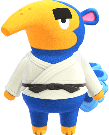 Cyrano is an indigo-colored anteater with a orange colored snout, face and paws. He has freckles on the bridge of his snout and thick, black eyebrows, which are always lowered and slant inwards, giving the impression that he is glaring. The inside of his ears are pink. He initially wears the wave shirt in Animal Forest through Animal Forest e+, and the dawn tee in Wild World, City Folk, and New Leaf.