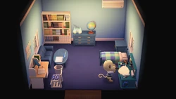 In New Horizons, his house takes on a different appearance. The house has a blue color scheme, and objects like the bookcase, globe, and writing desk indicate he's more of a modern world-traveler.