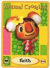 Faith is a sisterly villager. When befriended, she will give the player fighting tips and teach them ways to relax. Faith will also give the player medicine if they are stung by a wasp. Like all sisterly villagers, Faith is tough, but she will still care deeply about her appearance. Faith has a tendency to stay up very late at night. It is easy to get her picture since developing friendships with sisterly villagers is simple due to her caring and protective nature, sometimes talking to the player about her friendship with her old neighbor's son. Faith may get along with jock villagers who share her love of sports, lazy and normal villagers for how laid-back they are, and peppy villagers. However, she may conflict with smug and snooty villagers due to their arrogant nature. Faith may clash with cranky villagers due to their similarly stubborn personalities, but often end up becoming best friends.