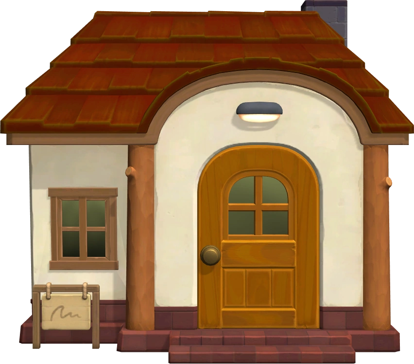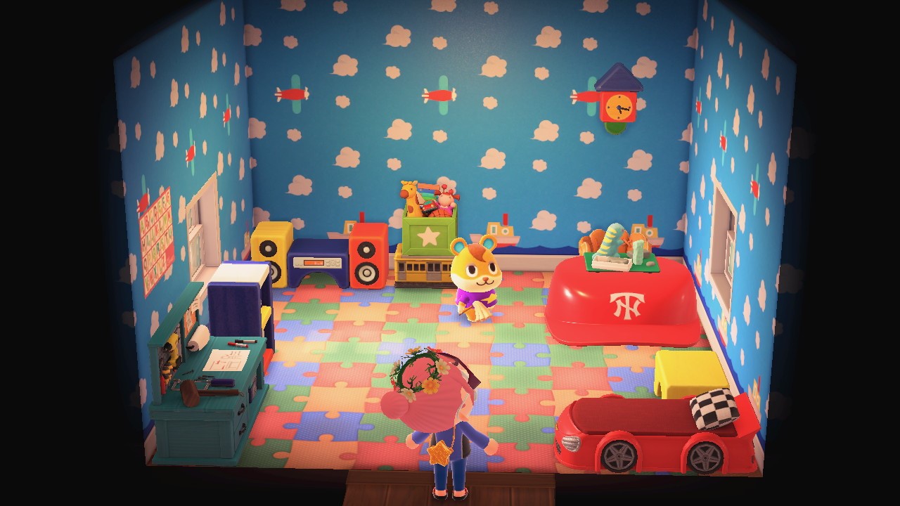 In New Horizons, Hamlet's home is again a playroom theme with various Wooden-Block crafted pieces. He uses a Race Car Bed, and now owns a Wooden Block Stereo. A green Toy Chest can be seen, along with a Puzzle Flooring.