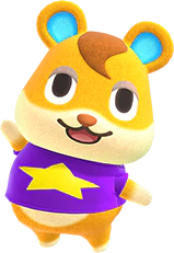 Hamlet has yellow fur, a brown tuft of hair on his head, and half-closed, tired looking black eyes. The insides of his ears are teal. He initially wears a star shirt. Like the other hamsters, he is one of the shortest villager types.
