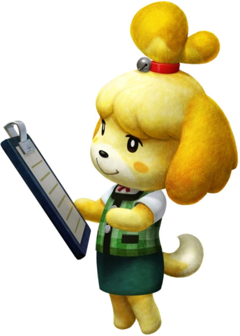 Isabelle (しずえ Shizue?) is a female Shih Tzu dog who debuts in New Leaf. She assists the player in their new role as the town mayor as their secretary and assistant. She is also the older twin sister of Digby, who works and stands at the front entrance to the Happy Home Showcase. She also appears in the spin-off games Happy Home Designer, amiibo Festival, and Pocket Camp. Isabelle is the current mascot of the Animal Crossing series, along with Tom Nook.