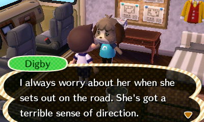 - If the player talks to Digby in this update, he will mention that Isabelle occasionally takes road trips and claims she has a "terrible sense of direction,” sometimes getting lost just walking around Town Hall.
