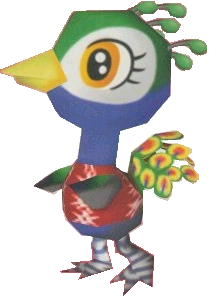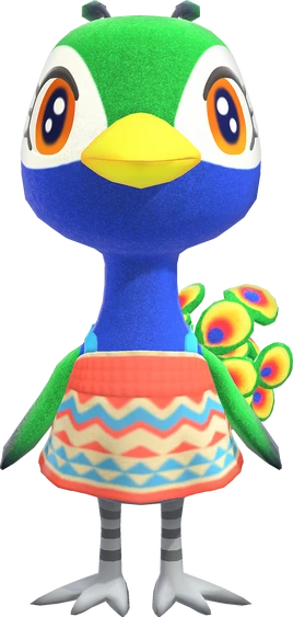 Julia is a blue ostrich, colored to resemble a peacock. Her eyes are large, with big black pupils with two little sparkles in each, and irises that are yellow-orange. There are three eyelashes on the side of each of her eyes, and she has a yellow beak. Her head and body are blue, while her wings and the top half of her head are colored green. She has white surrounding an area around her eyes, and a tail of rainbow feathers. The feathers are blue, red, orange, and yellow. Each tail feather is outlined with green. Her feet are gray striped with black. Her initial clothing is the Red Aloha Shirt in Animal Forest e+, and the Purple Tie-Dye Tee in New Leaf. Julia wears a coral-colored Zigzag-print dress in New Horizons. She will carry a Rainbow Umbrella during rain.