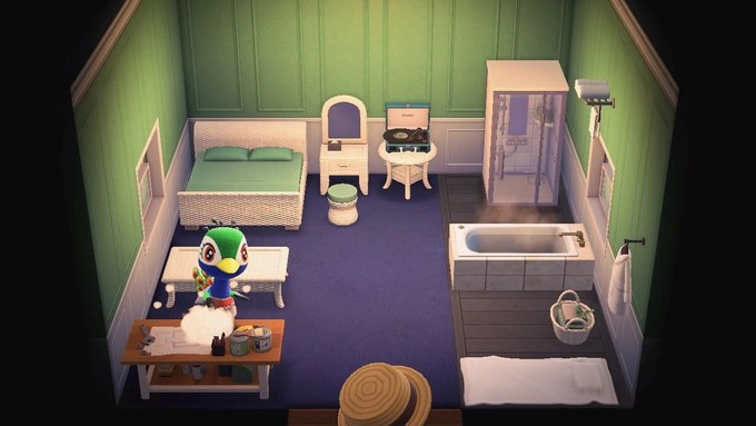 In New Horizons, Julia's house is split into a bedroom and a bathroom, with a spa theme to it. The right half of the room is separated by two Black wooden-deck rugs. Her bedroom area mostly consists of the Rattan Series with the white bed, vanity, stool, low table, and end table. Her bathroom contains a Shower booth, a Long bathtub, a Rattan towel basket, and a Beach towel. She has a Bathrobe and Bathroom towel rack hanging on the wall. When she is crafting a DIY recipe, she uses an oak Ironwood DIY workbench.