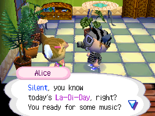La-Di-Day is an event in Wild World that occurs every second Saturday of every odd-number month. Villagers participate in a competition for a new Town Tune. The only villagers who don't participate are those who are sick, moving in, or moving out.