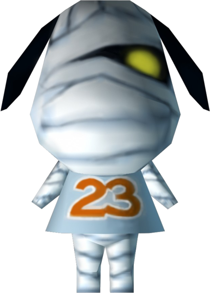 Lucky is a dog that is almost fully wrapped in bandages. His left eye is seen peeking through his bandages, which is glowing yellow with no pupil. The fur around his eye, on his ears and on his tail is fully black. His initial shirt is the #23 Shirt.
