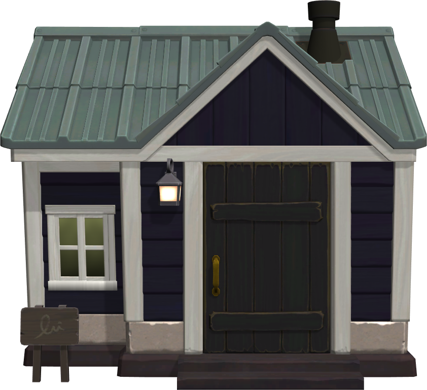 In New Horizons, the exterior of the house are black shackled tiles with white trim as the border. The door is a light grey while the roof is a sea foam green. The interior of his house, however, is not Egyptian-theme in the previous versions of the games, but resembles more of a graveyard. Included in the house are a skeleton, three different variations of the Western-style stone, a red-leaf pile, two tiki torches on either side of the room, a wooden bucket and a skull music player. The wallpaper depicts a decaying brick wall while the floor resembles a dirt path with various branches and twigs.