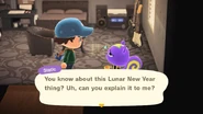 The Lunar New Year is an event present in the South Korean version of City Folk and New Leaf, as well as in all versions of New Horizons. It coincides with the current year's date for the Chinese New Year. Villagers will have special dialogue related to the celebration while it is active.