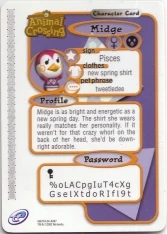 Midge has a normal personality, and frequently acts kind towards the player. Normal villagers generally get along well with lazy, peppy, smug, snooty and other normal villagers. Midge may conflict with cranky and sisterly villagers. As a normal villager, Midge will usually wake up at 6:00 am and is easier to befriend than most. Both normal and peppy villagers reference an unseen friend known as Moppina.