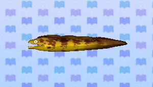 The moray eel is a rare ocean fish introduced in City Folk. It is found all day during late summer and early autumn. It is yellow with a brown top and tail. It sells for 2,000 Bells.