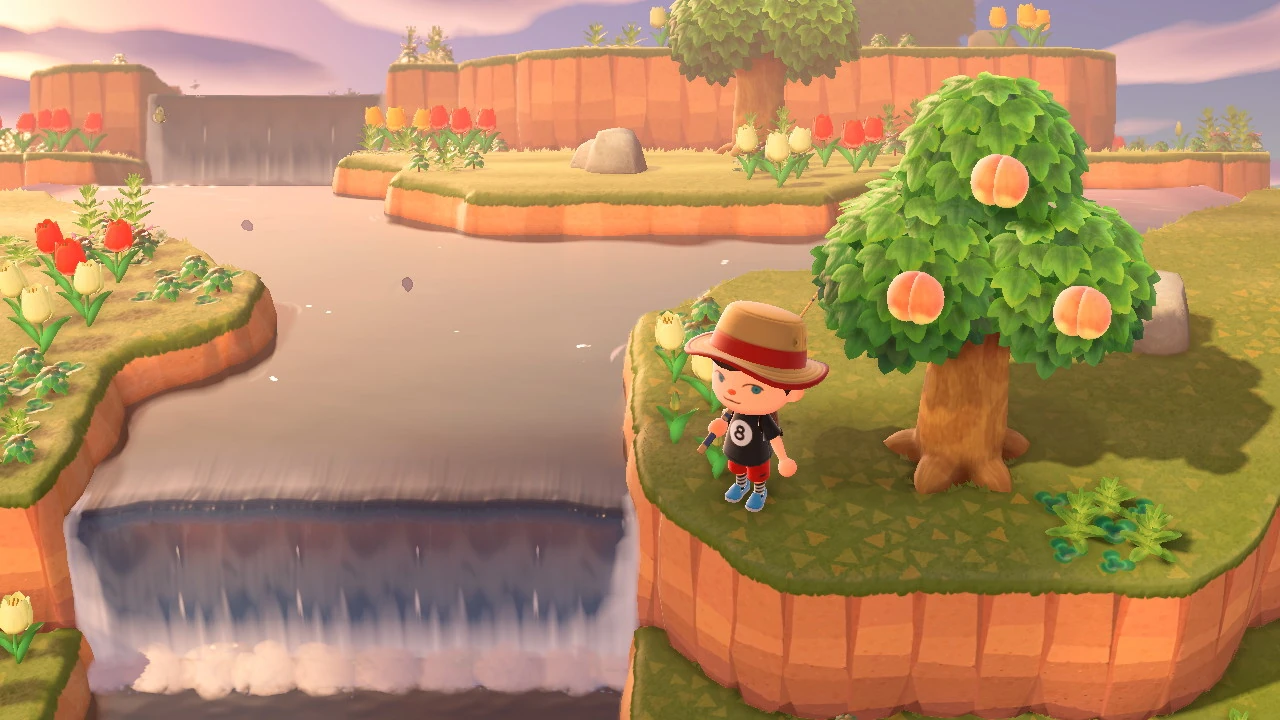 | Requires the Resident Services building upgrade. A 3-layer island with a selection of fruit-bearing trees, cedar trees, and palm trees. The highest-most level is a small waterfall with one outlet to the second level. There is a small outlet to the left and then finally flows to a small outlet at the bottom left. There are only size 4+ fish here making getting rare size 6 fish easier. The island also has rare hybrid flowers and only spawns bugs that appear on flowers such as mantis and ladybugs. | |||
