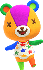 As a lazy villager, Stitches will be friendly and easy to get along with due to his laid back lifestyle. Like all lazy villagers, he has a love of food and relaxing. He will enjoy partaking in the usual hobbies, usually for relaxing reasons or for food, like when fishing. Stitches will get along well with other villagers, but may offend or confuse jock villagers, who have a lifestyle of exercise and fitness, which conflicts with the lazy lifestyle of relaxing and food. He will get along with other lazy villagers with whom he will talk about food, comics, or superheroes. He will also get along well with normal, peppy, smug and sisterly villagers, and occasionally cranky villagers, but may from time to time annoy snooty villagers, who disagree with the lazy lifestyle.