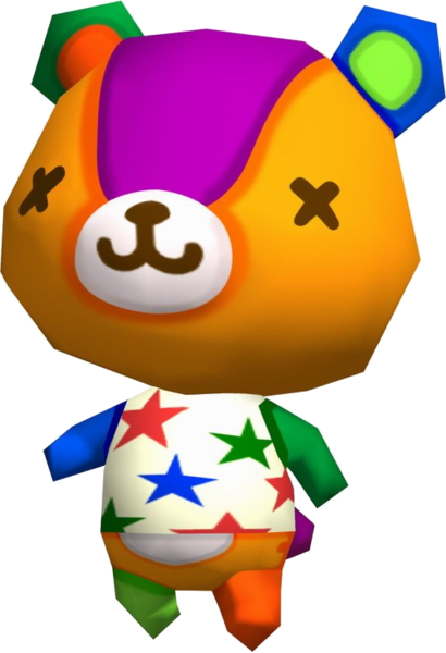 Stitches (パッチ,Pacchi?, Patch) is a lazycubvillager in the Animal Crossing series. He is based off of a young child's worn stuffed animal, indicated by his name and the many patches of fabric making up his body. This also gives the reason for the kiddie furniture in his home. His catchphrase is based on the stuffing used in dolls and teddy bears. He is one of the few villagers that is technically not an animal, along with Sprocket, Del, Coco, Ribbot, and others.