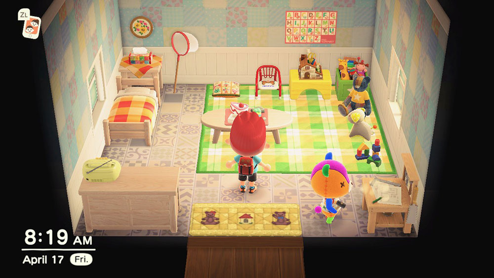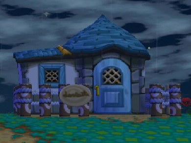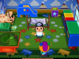 His house has a kiddie theme and has lot of toys, such as a train set and an elephant slide from the nursery theme. He also has a hammock, a green lamp, and furniture from the playroom theme. He has the Playroom Wall and Playroom Carpet. K.K. Lullaby plays on the Kiddie Stereo in his house.