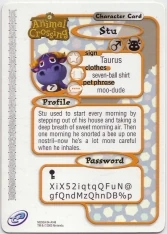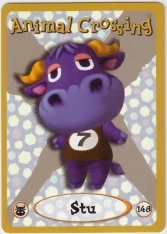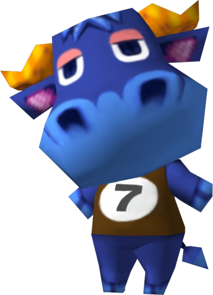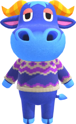 Stu is an indigo bull with pink eyelids and horns that are striped orange and yellow. He has some hair atop his head which is colored a lighter blue from the rest of his body, with his muzzle, hooves, and tail-tip matching this color. His nostrils are very large, and his eyes are half-lidded in his default expression. He wore the seven-ball shirt in every game prior to New Horizons, where it changed to the Yodel Sweater.