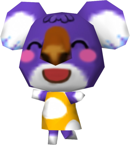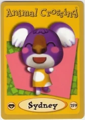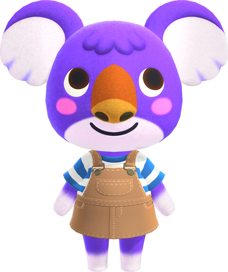 Sydney is a purple koala, with pink blush and white fur in her ears and around her chin. Sydney has a brown nose with prominent nostrils and a tuft of fur on her forehead. There is a noticeable white gradient on the tips of her paws and on her chin. However, in New Horizons, her paws and chin have been given a very light shade of pink. She wears a Big-Dot Shirt in every game prior to New Leaf, where it changes to a Big-Dot Tee. In New Horizons her outfit changes to an Overall Dress.