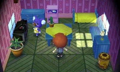 In New Leaf, Sydney owns numerous items from the Blue series, including the blue bed, blue bureau, blue bench, blue dresser, and a blue table with a tall mini cactus. She also has a game shelf, a Mega Lamentoid, an aloe plant, and a retro stereo that plays K.K. Country. Her wallpaper is the parlor wall and her flooring is the ranch flooring.