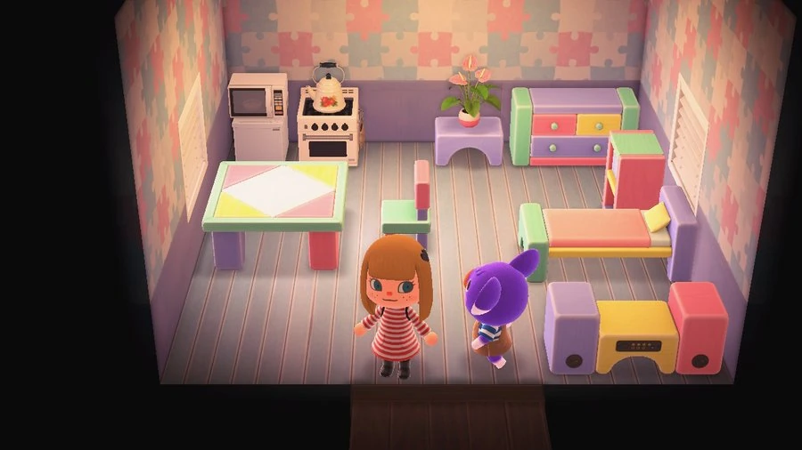 In New Horizons, Sydney owns numerous items from the Wooden-block set in its pastel variation, including a wooden-block bed, wooden-block chest, wooden-block bookshelf, wooden-block chair, wooden-block table, wooden-block stool, and a wooden-block stereo that plays Drivin'. She also owns a microwave, mini fridge, air conditioner, humidifier, anthurium plant, pot rack, and a gas range with a simple kettle. She uses the purple puzzle wall as wallpaper and the blue-paint flooring for flooring.