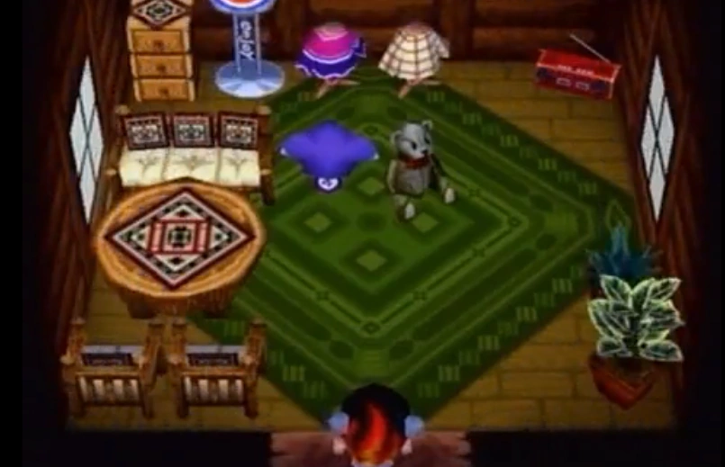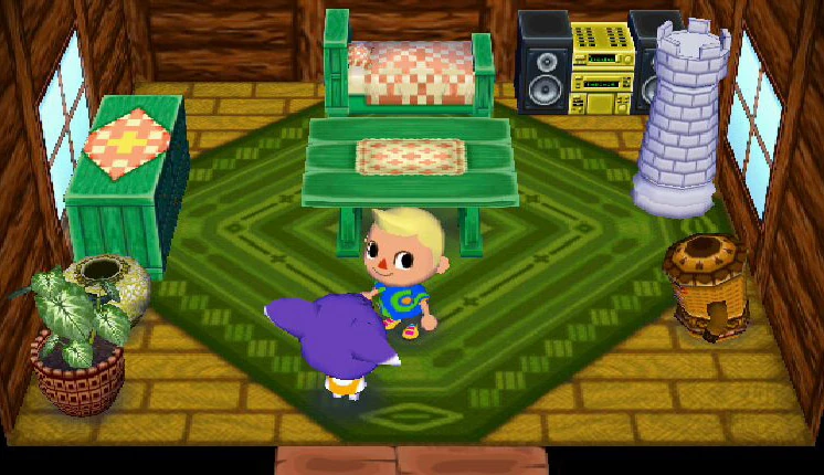 In Animal Crossing, she listens to K.K. Jazz. In City Folk, her house has a slight log cabin theme. Her house includes the cabin wallpaper and green rug, sometimes