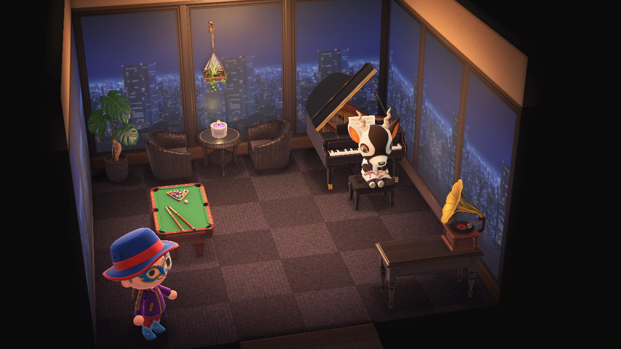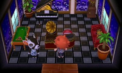 In New Leaf, Zell has some of his furniture form the Gorgeous Series, along with a ebony piano, a billiard table, pothos, 2 stools, a vintage telephone, Dracaena, a Phonograph, and a sconce. The wallpaper he has is the Cityscape wall and he also has the Modern tile. All of this gives his house a classier look.