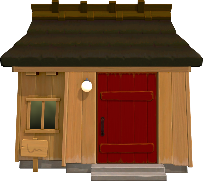 In New Horizons, Zucker's house resembles an outdoor vendor, referencing how takoyaki is associated with yatai street food stalls. He has an ocean-themed stall with a cutting board and a steamer-basket set on top. Next to the stall, he has a blue cotton candy machine. Behind, he has a table with a gray stand mixer. He also has an orange box, pear box, red outdoor generator, and log bench surrounding the stall. For wallpaper, he uses the chain-link fence, and for flooring, he uses the backyard lawn. The wallpaper and flooring make him look like he is selling outdoors in a city.