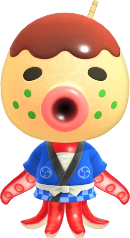 Zucker (タコヤ, Takoya?) is a lazy octopus villager who first appeared in New Leaf. His English, Dutch, and Russian name comes from "sucker", referring to the suction cups cephalopods have on their arms, and is also German for "sugar", likely in reference to his food-like appearance. His Japanese name and general appearance refers to the Japanese snack takoyaki (たこ焼き), which is a fried ball of dough commonly filled with minced octopus. His catchphrase is a reference to how he is an underwater animal. He has the same initial phrase as Bertha. He has the nature hobby.