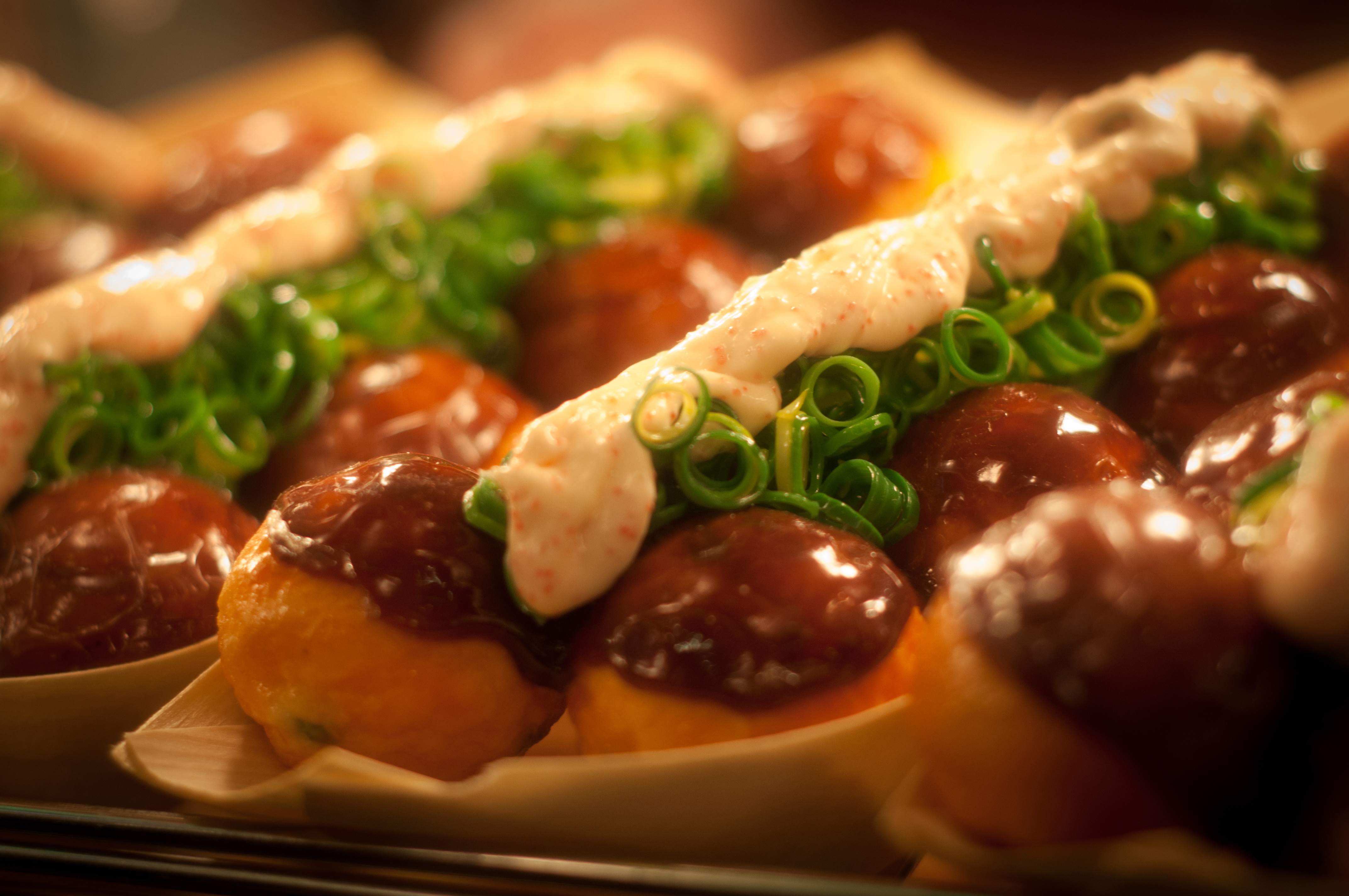 Takoyaki, with sauce, green onion, and mayonnaise.